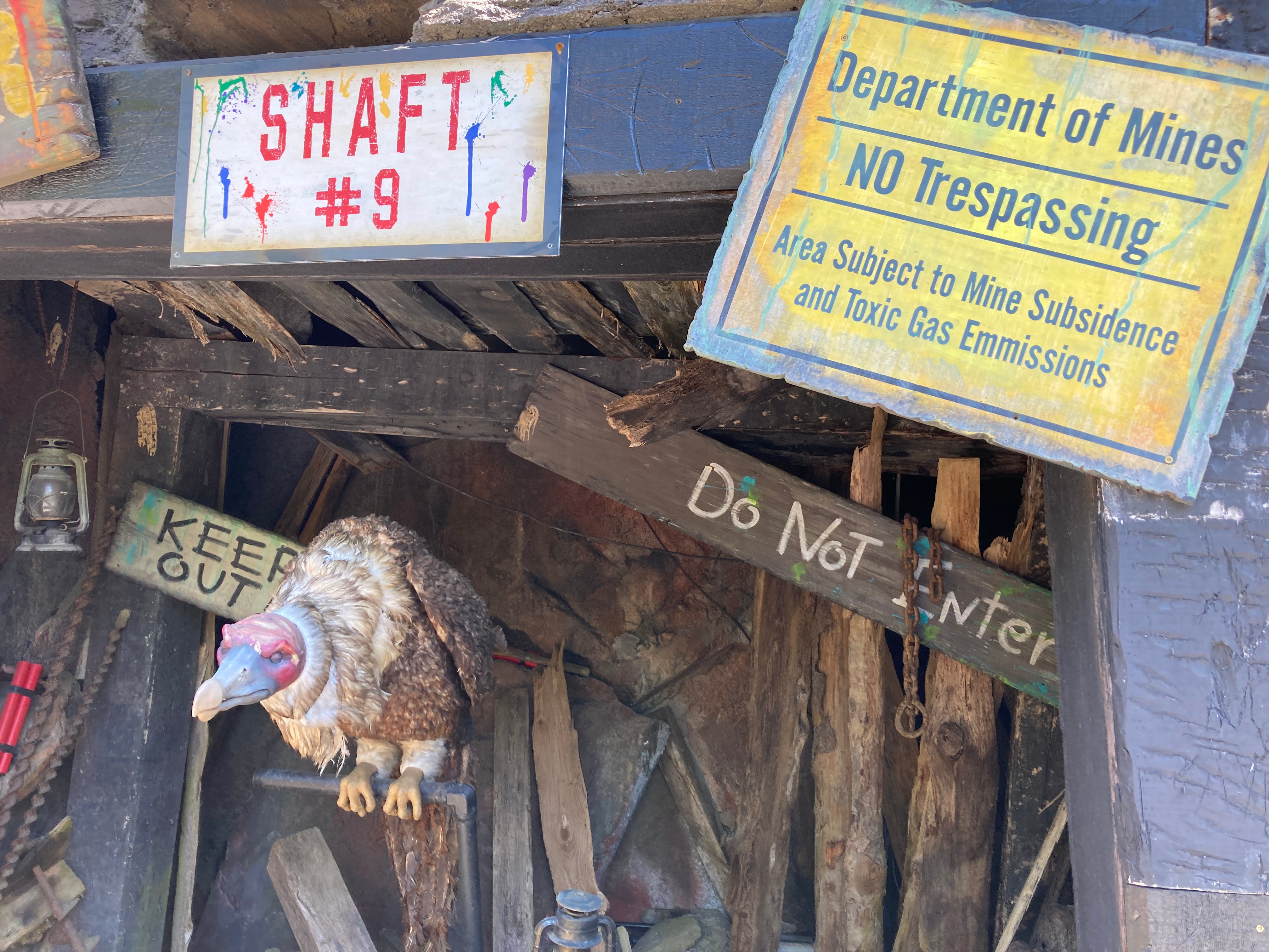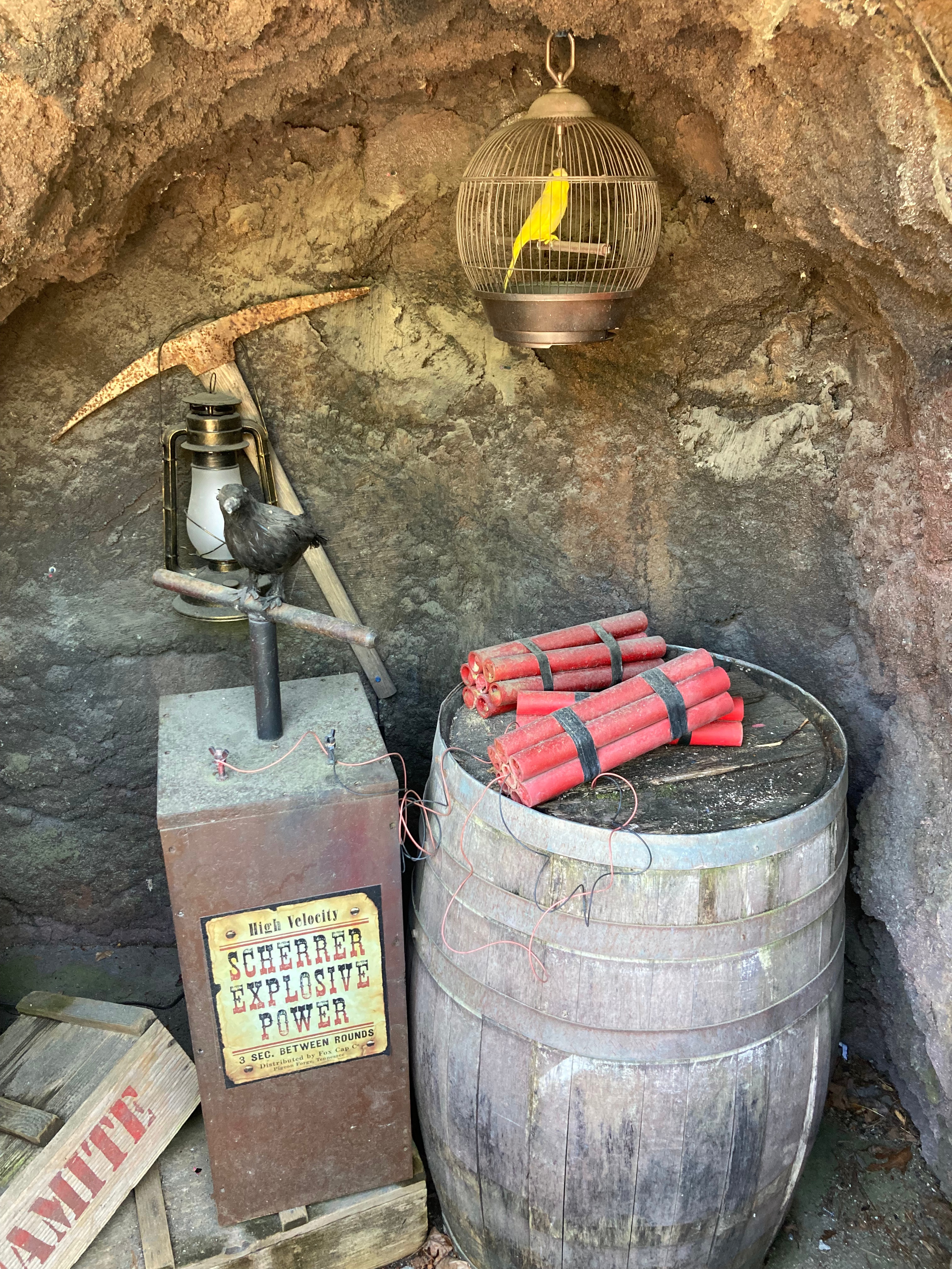 Nervously, I boarded the minecart with my friends. One of the first things that stuck out to me was a canary in a small cage falling from its perch to the bottom of its cage. I remember going on a tour of an old abandoned coal mine in Alberta, Canada and learning about how miners would hang up canaries in cages throughout the mine. If a canary stopped singing and dropped from its perch, it was a sign that miners needed to evacuate as the air was becoming noxious from mine gas. This is smart theming, I thought. Someone knew this small detail to include it in the mine. As the ride progressed, there were a few other themed moments that stuck out to me, including those with vultures, a lightning storm and dynamite.
