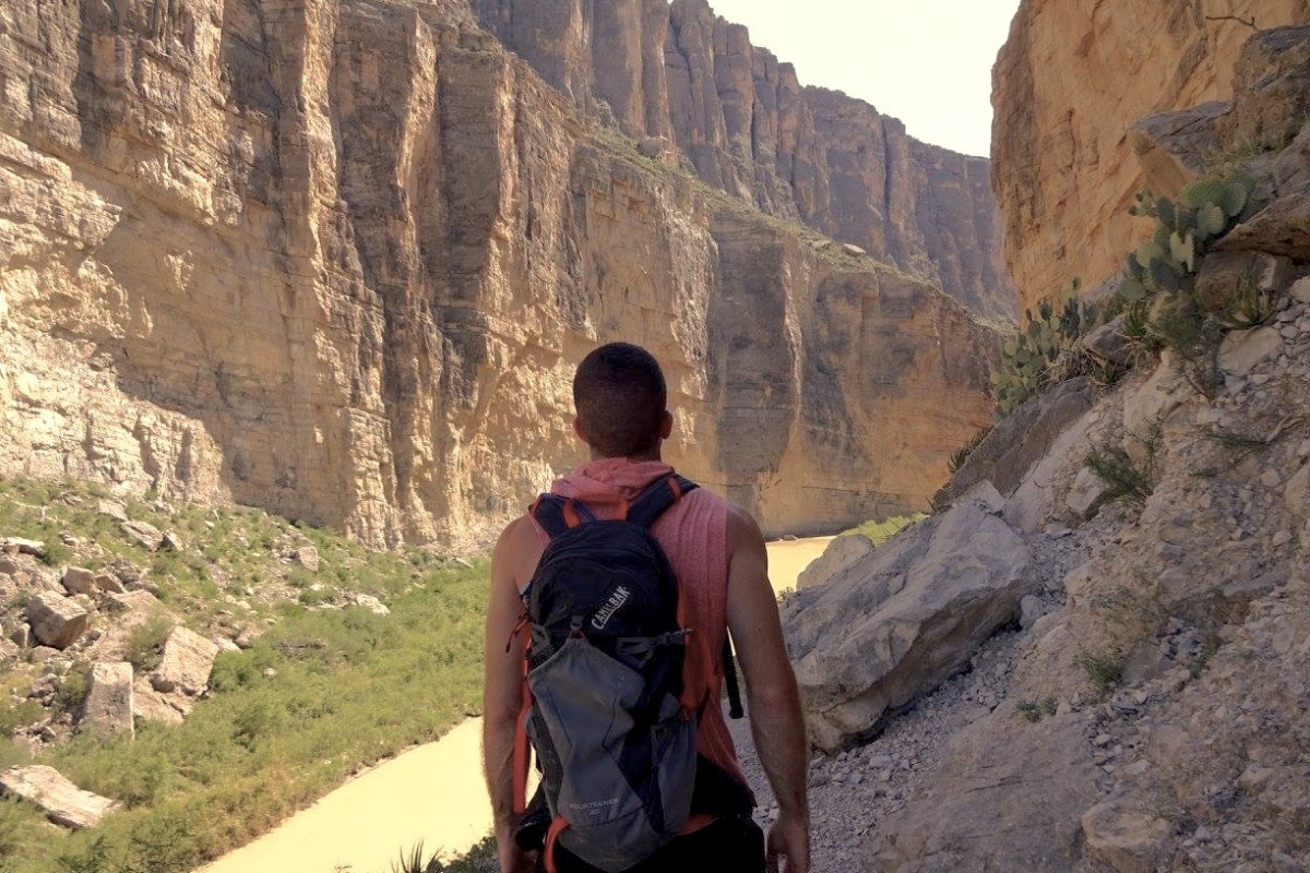 Eventually, after a brief moment of uncertainty, I arrived in Santa Elena Canyon where giant cliffs forming the canyon walls measure 1,500 feet. Here one cliffside is Mexico and the other is the United States of America, and the Rio Grande flows in a murky pale brown in between. On the U.S. side, about halfway down the cliff faces, rock erodes leaving piles and a bar alongside the river where trees and other plant life grow. This is where the established trail is found.
