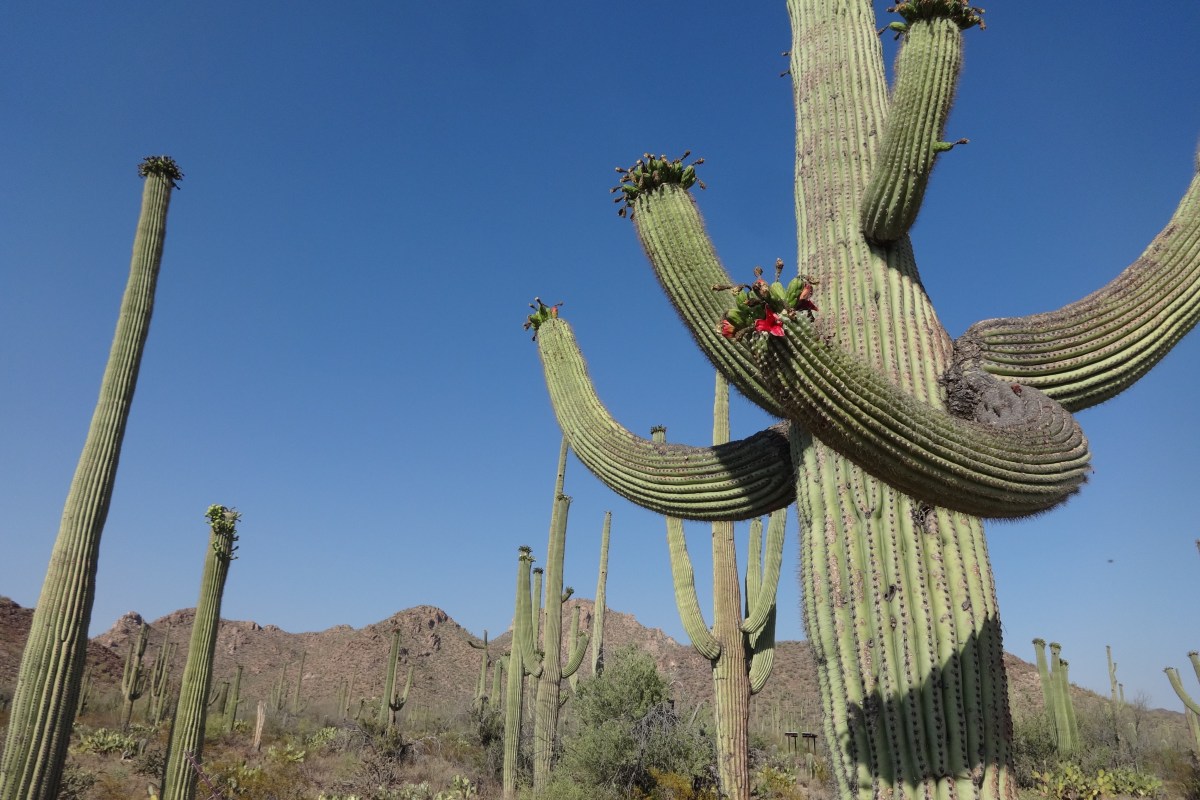 Desert Discovery Nature Trail, which is a short interpretive half-mile loop around various cacti. There were some impressive Saguaros to observe. I learned that the inside of the Saguaro cactus can be up to 20 degrees cooler than the air outside. Therefore birds, kangaroo rats, and even foxes find shelter within the cactus. I would have never known this and find it fascinating that there is much more to the cactus than what meets the eye. Walking around the trail loop was intriguing as simple and short as it was. I had been in deserts before but not a desert with so much cacti and plants. The ground itself was very barren and crusty but all over and placed, in such an impressive array, were all sort of cacti and rocks. It almost looked like it was designed purposely despite it being wild. Also looking up at the Saguaro evoked a feeling similar to that of looking upon the mighty Sequoia- both are iconic, stately, and extremely resilient plants. While the Sequoia is largely fire resistant, the Saguaro is heat and sun resistant, enduring extreme heat and sunlight. These plants just give off an inspiring essence of strength.
