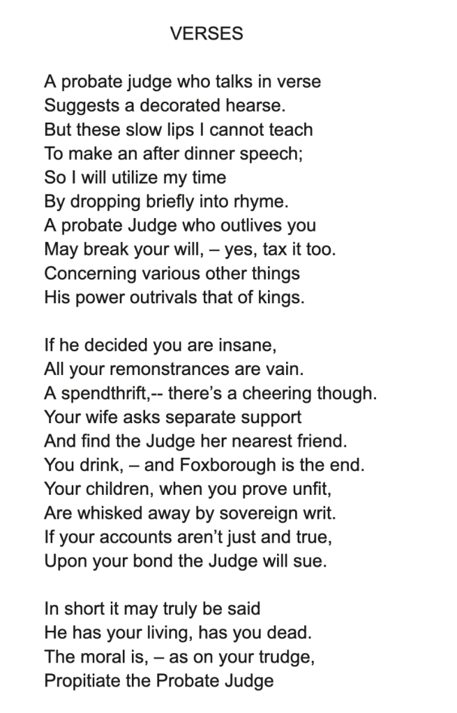 Robert Grant offered a lasting friendship of joy and literary works of good humor but also stories of weightier matters which spurred Roosevelt on in his concerns about “easy divorce” in the nation. Below are two poems from Grant, one concerning the love for his wife, written for her on the occasion of their 25th anniversary in 1908 and another dealing with divorce as a probate judge, delivered at a dinner of the Bar Association of the County of Middlesex, Dec. 4, 1907. These poems are made available through Henry W. Taft’s original copy of Grant’s Book, Occasional Verses, pictured below: