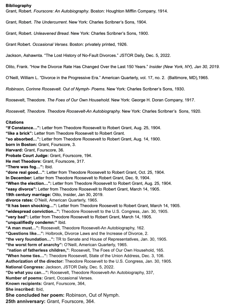 During the election of 1904 Roosevelt wrote to Grant: “When the election is over I want to have a chance of seeing you, not just for ten or fifteen minutes, but when I can go over at length with you some of the problems you touch upon in The Undercurrent.” Later, in December of 1904 Roosevelt wrote Grant inviting him and his wife to attend the judiciary dinner at the White House, spend the night, and stay through lunch the next day. On more than one occasion Roosevelt wrote in letters how he wanted to discuss matters in Grant’s books with him. One of the themes most explored by the two was divorce which was the main theme in Grant’s novel, The Undercurrent. Both men were drawn to divorce’s effects on society and the legality and morality behind it. A term both men brought up in their correspondence was “easy divorce.”